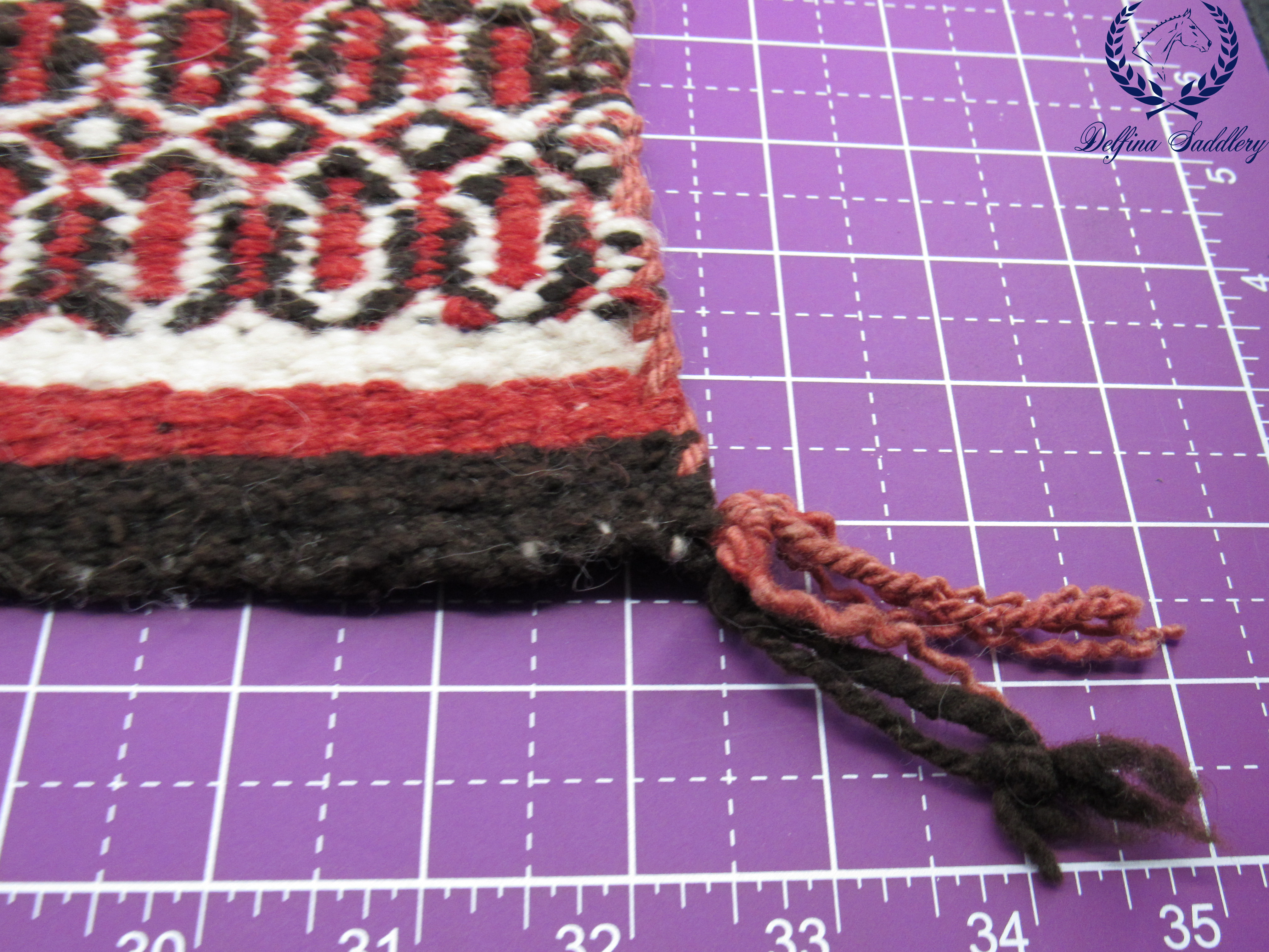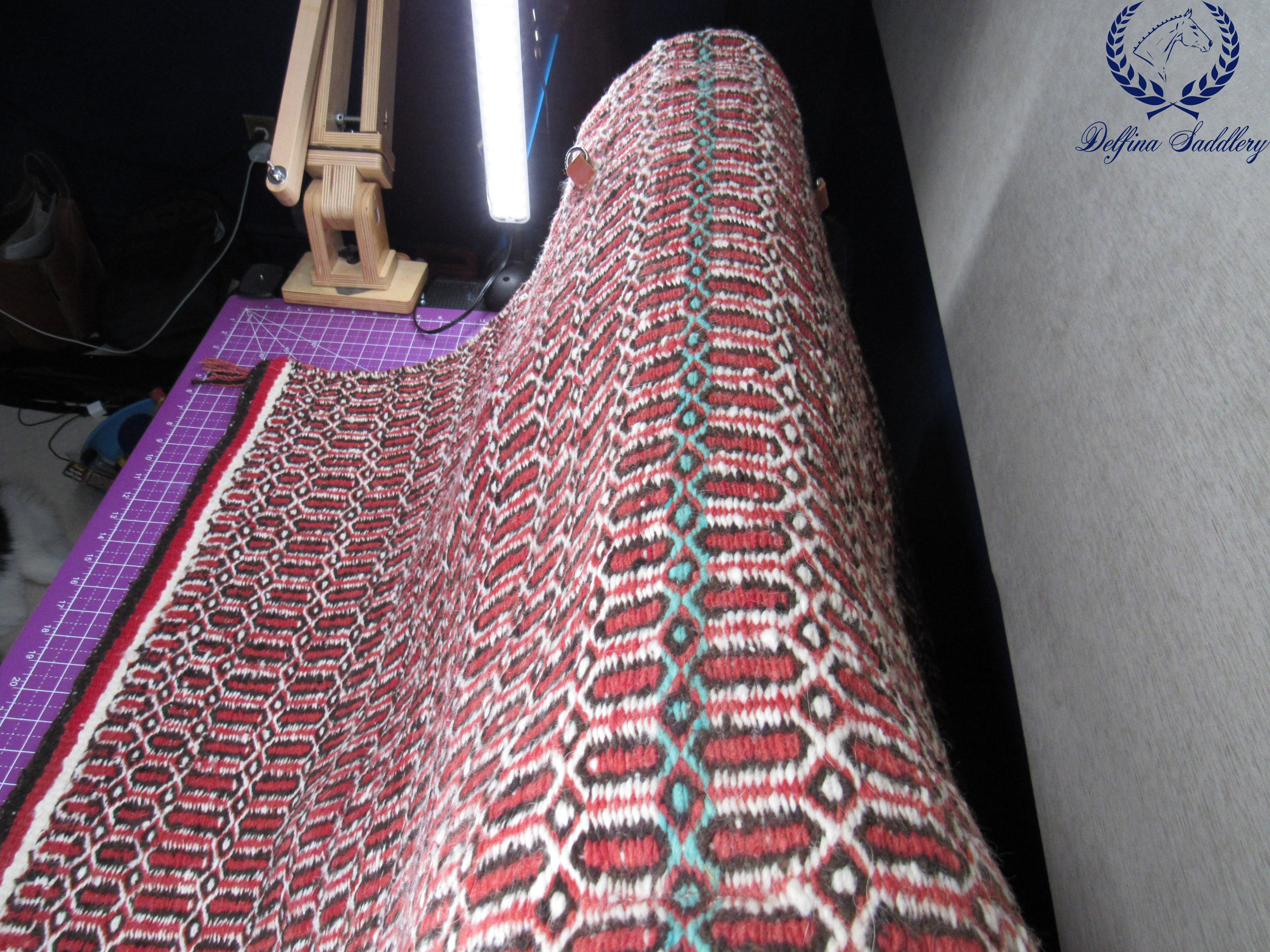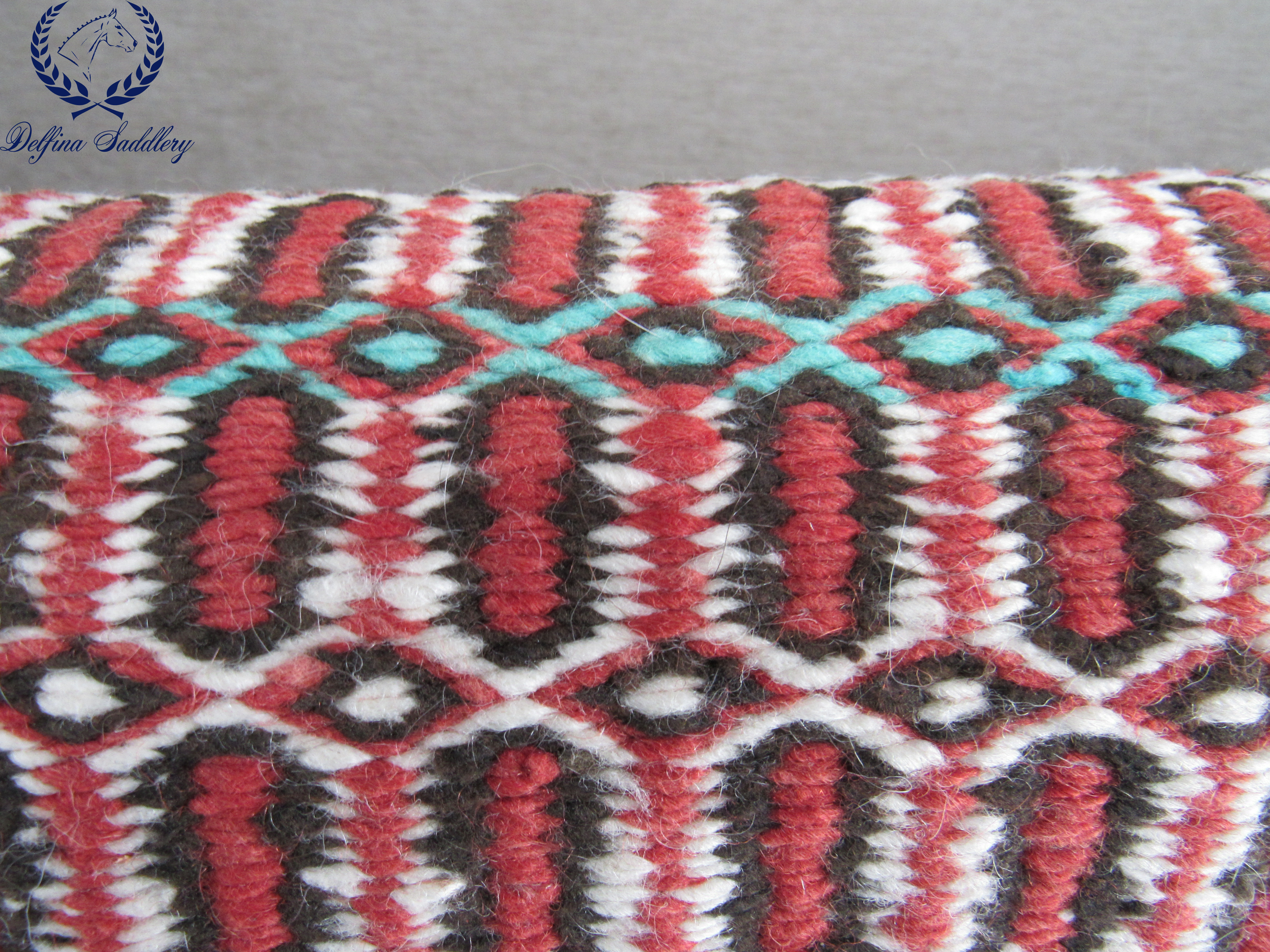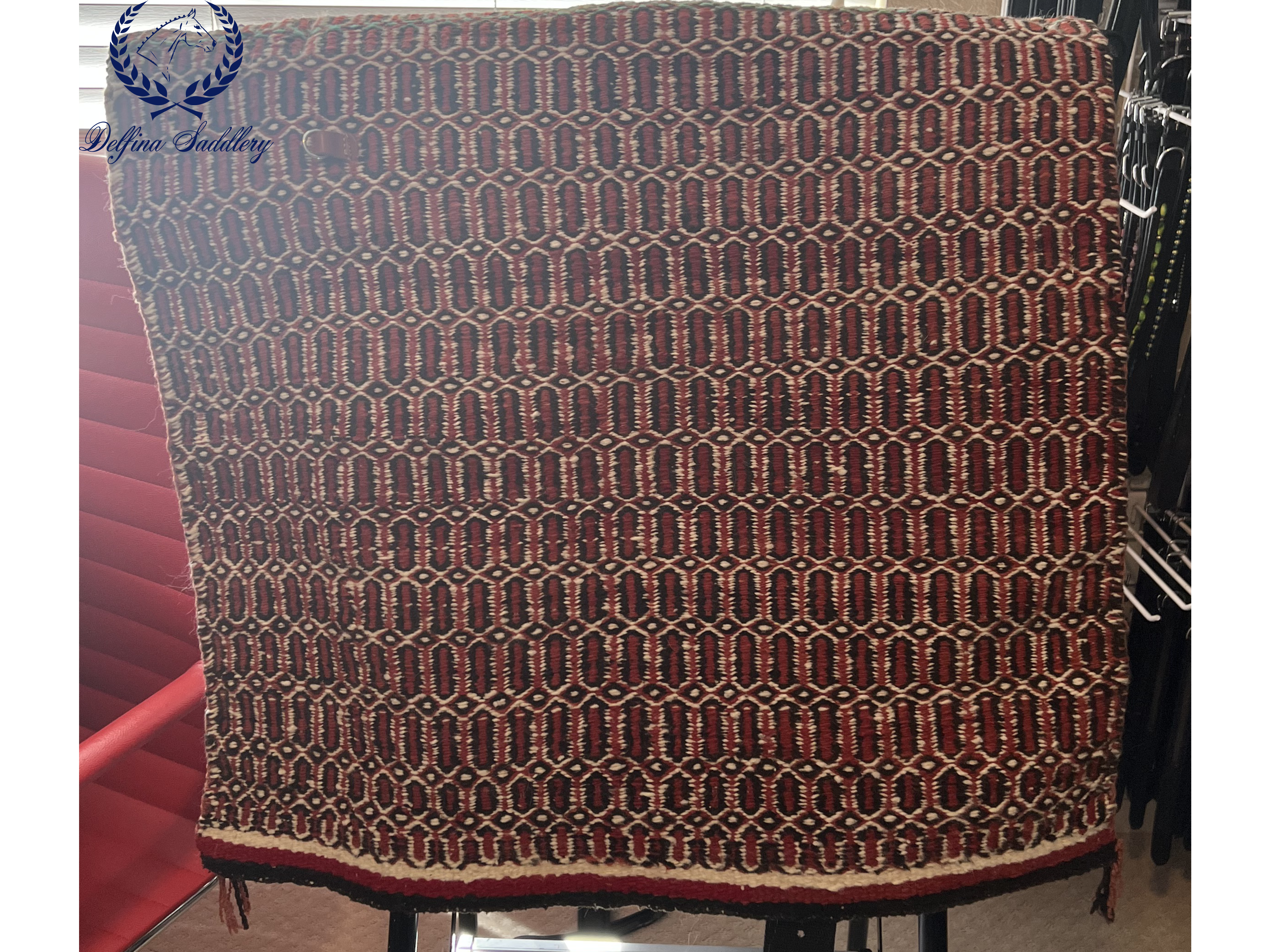 Initially purchased by the owner in 1985 at the Hubbell Trading Post in Ganado, Arizona, directly from Virginia Bia, who said, "the blanket is modern, most similar to a Mexican Saltillo diamond pattern. Unlike most sarapes and blankets, the pad is made from a very dense, coarse spun wool". The blanket is a combination of red, black, and white wool, with a reverse color pattern on the opposite side. There is a beautiful turquoise stripe down the center of the pad on both sides.