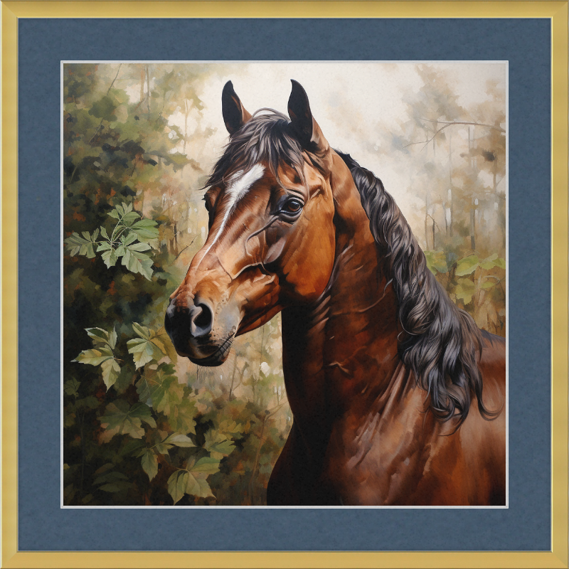 A beautiful bay stallion peers out from amongst the forest. Created by our in-house artist.