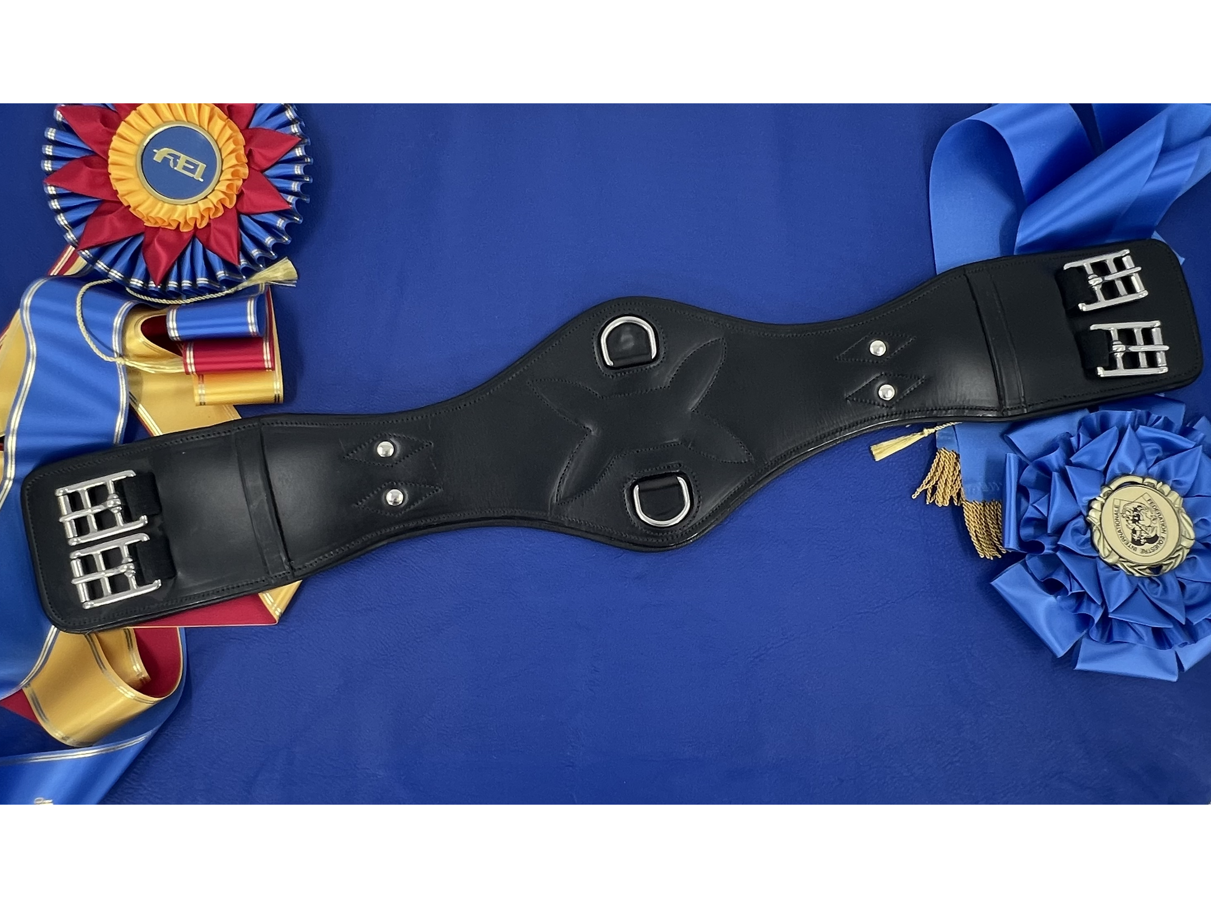 Custom Delfina hand-made dressage girth designed for use with an Abbott-Davies balancing rein, lunging equipment, or ground driving accessories.