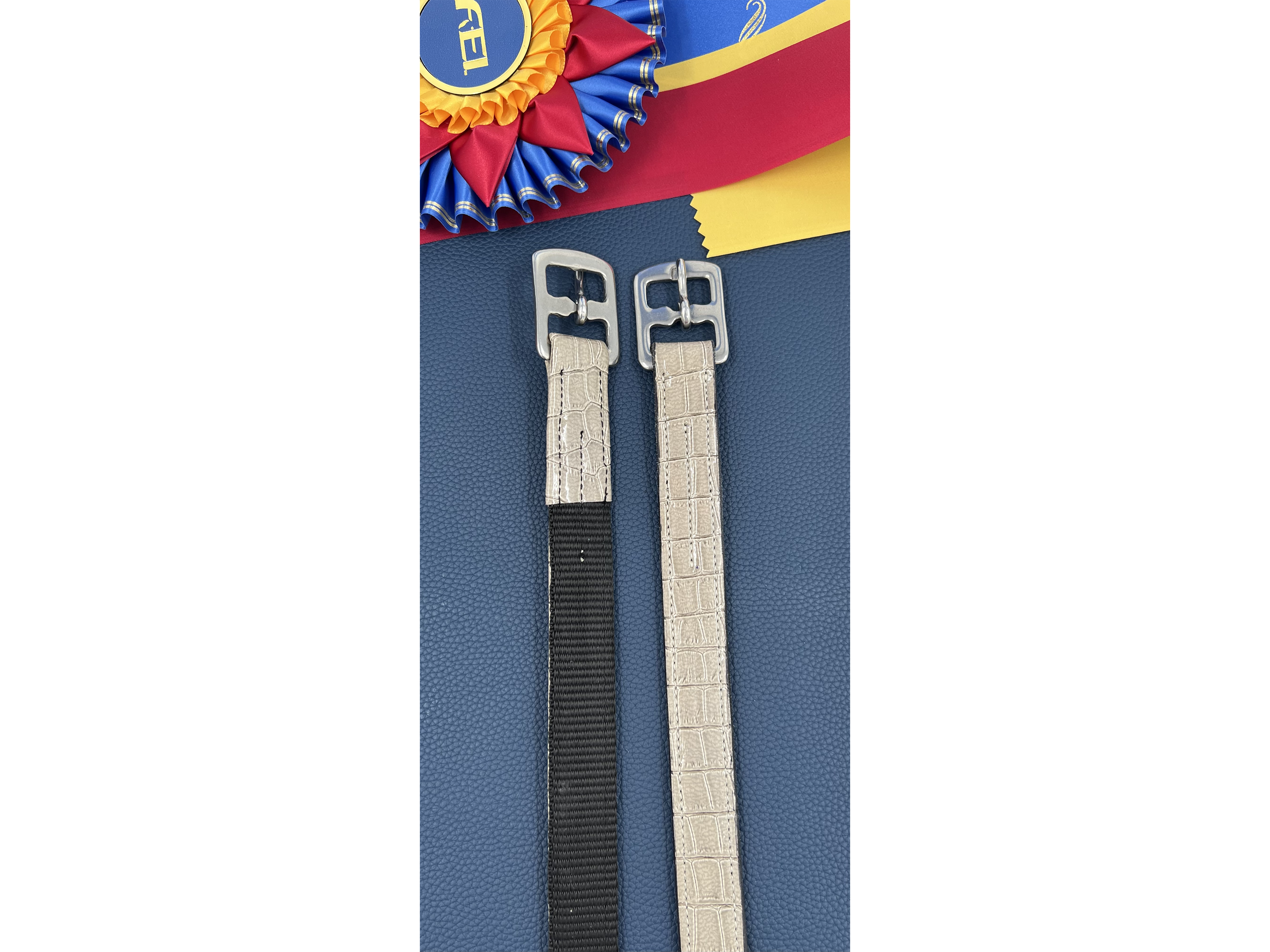 NEW Limited Collection beautiful Gray Crocodile Print Stirrup Leathers with black nylon or black leather on the back. Lays flat against your leg.