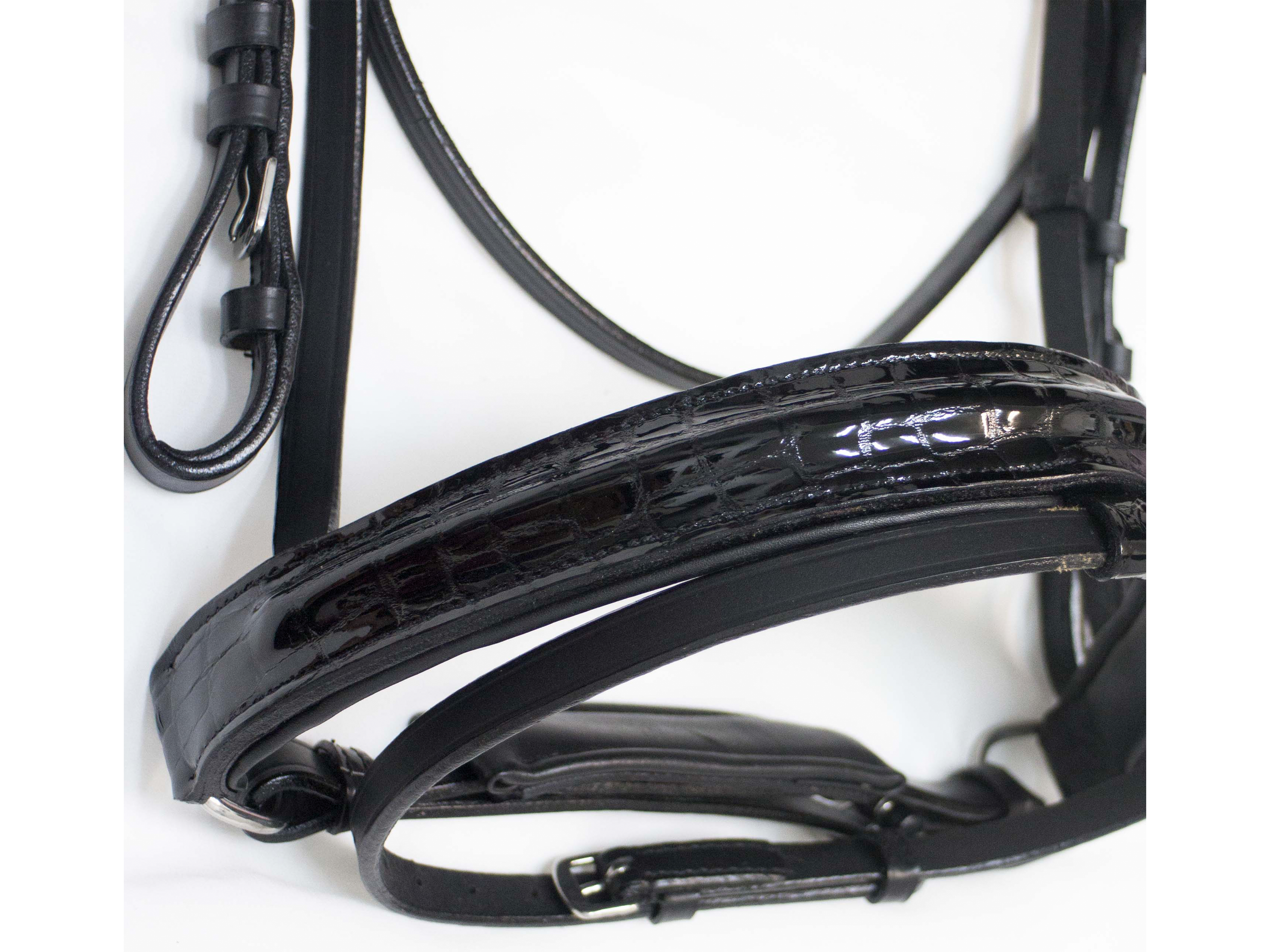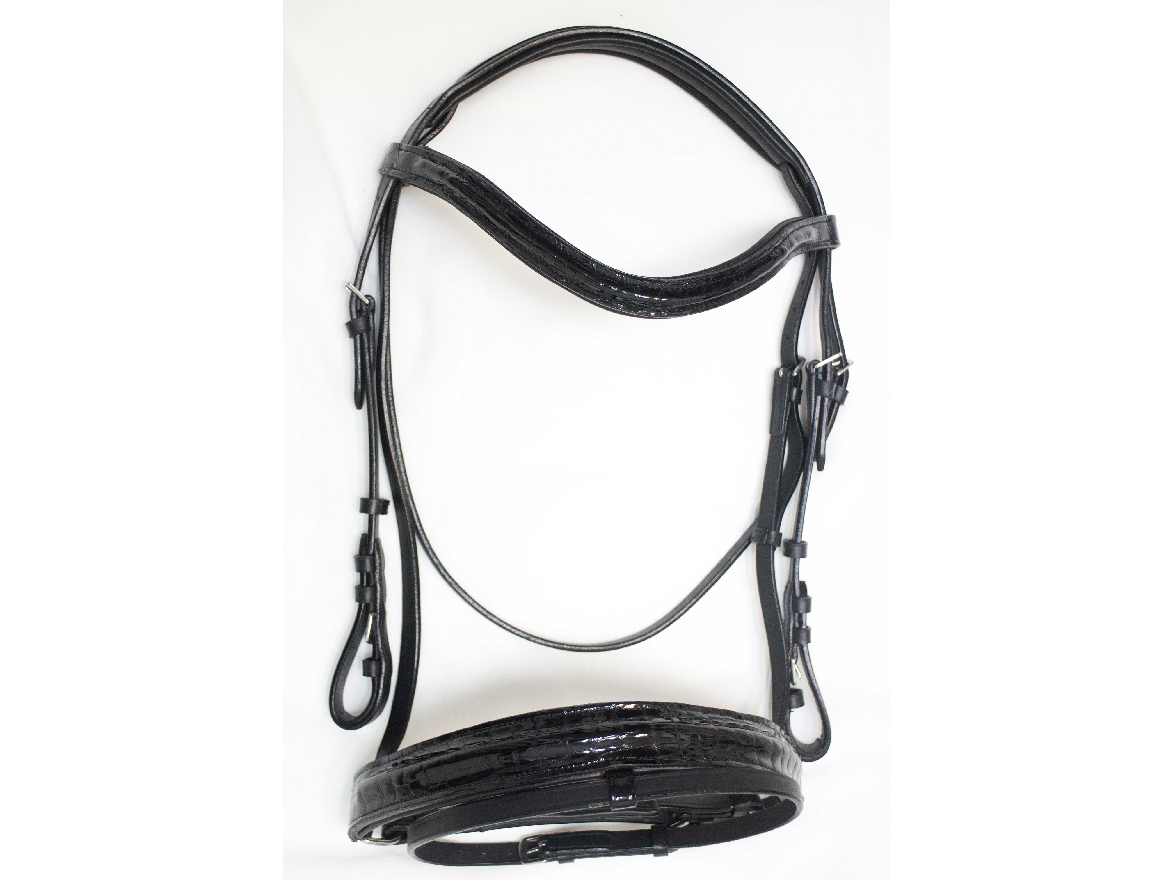 New! DELFINA brand black patent leather croc print dressage bridle. We rolled all of our most premium features into one single bridle so your horse (or pony!) will look as good as he feels!