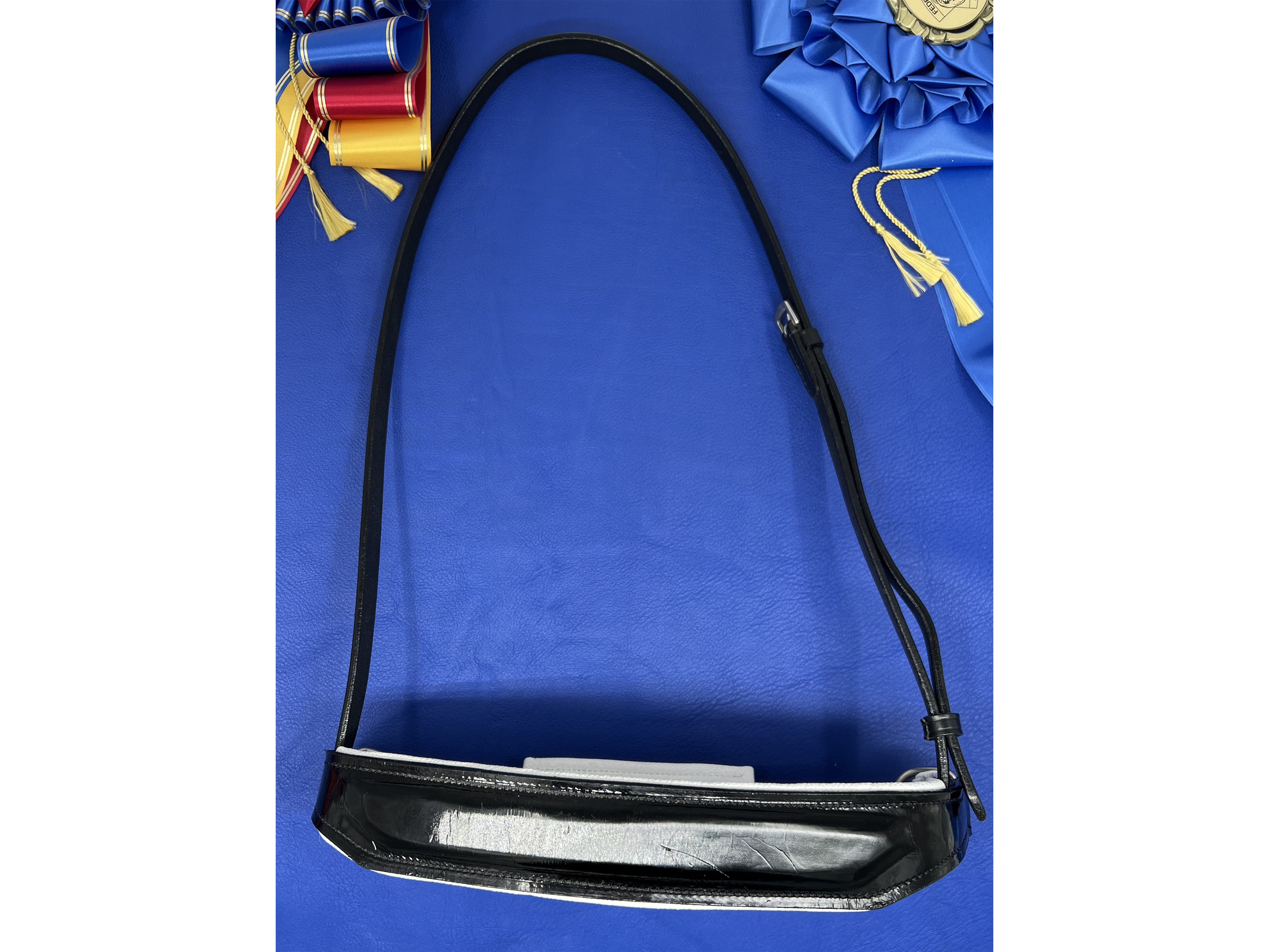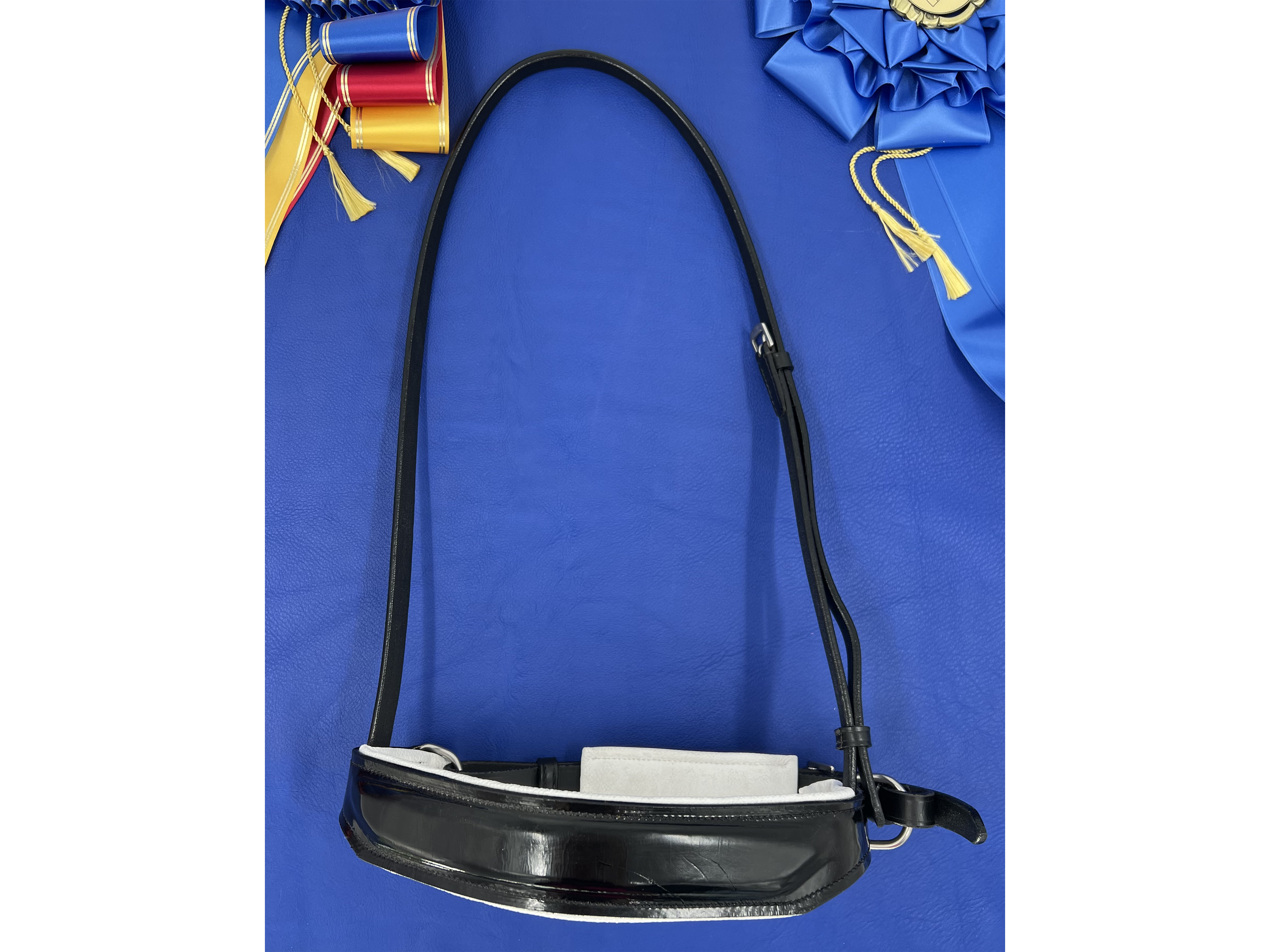 Delfina's wide anatomical noseband in a classic, flashy patent leather with bright white padding. A classic piece of dressage tack. Extra squishy padding around the nose and lower jaw. Includes a black crank pad with matching white padding.