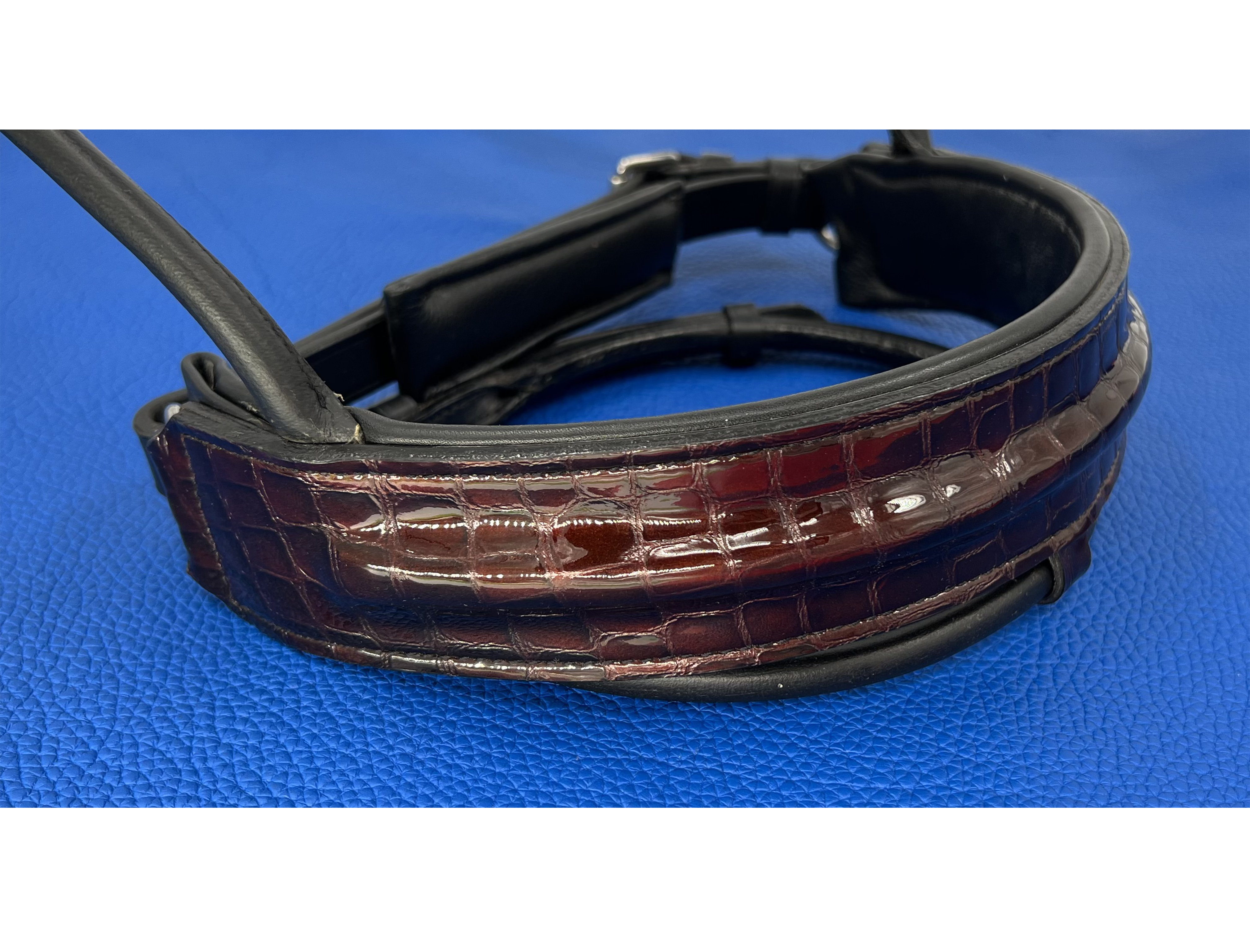 Truly unique, one-of-a-kind rolled, raised, brown, croc print nosebands. These nosebands measure 2 1/4" wide across the nose, with standard-width crank and pad. Round raised center very rarely seen in tack. This noseband would look beautiful on a large or coarse head.