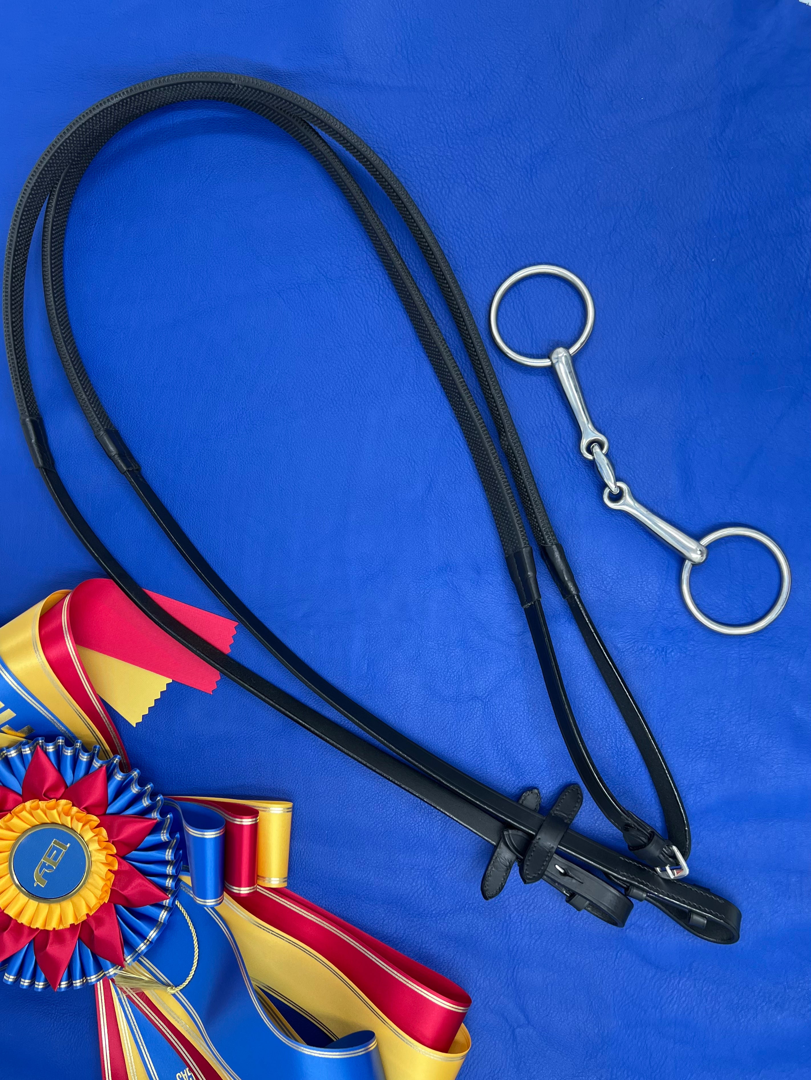 Made with high quality soft English bridle leather. These reins don’t feel stiff in the hand, yet still feel like they’ll last for years. These are not the soft, squishy, thin rubber reins you see at lower price points that melt in the sun. These reins are truly rubber coated leather reins - no shortcuts.
