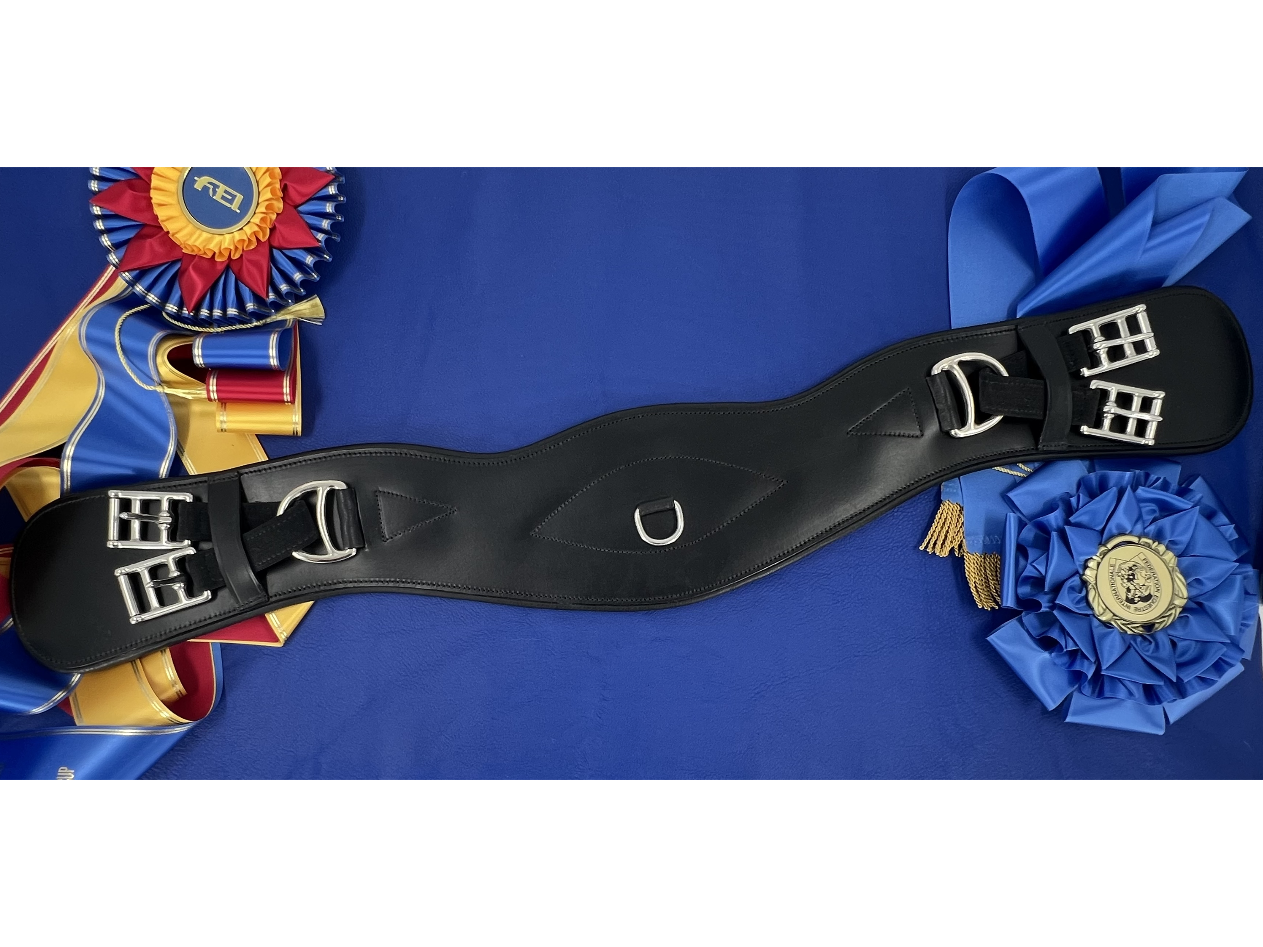 Custom Delfina Saddlery handmade anatomic short girth with soft-touch style buckles. Assists in properly balancing the pressure applied to each billet/side.