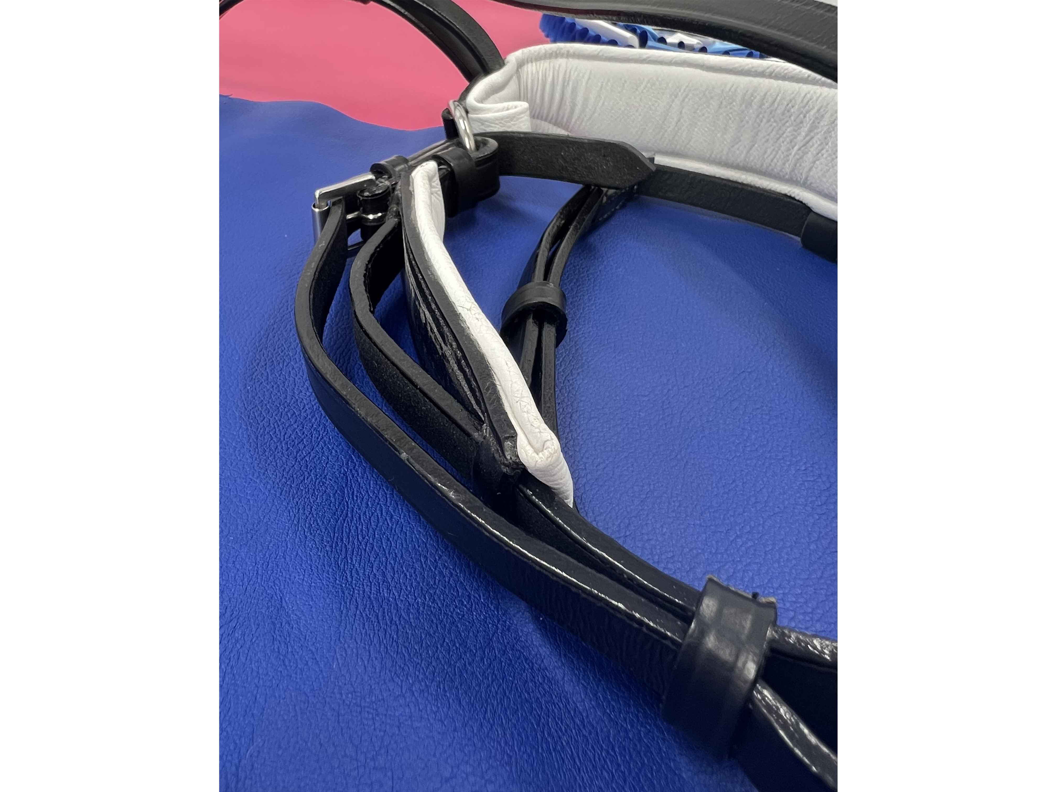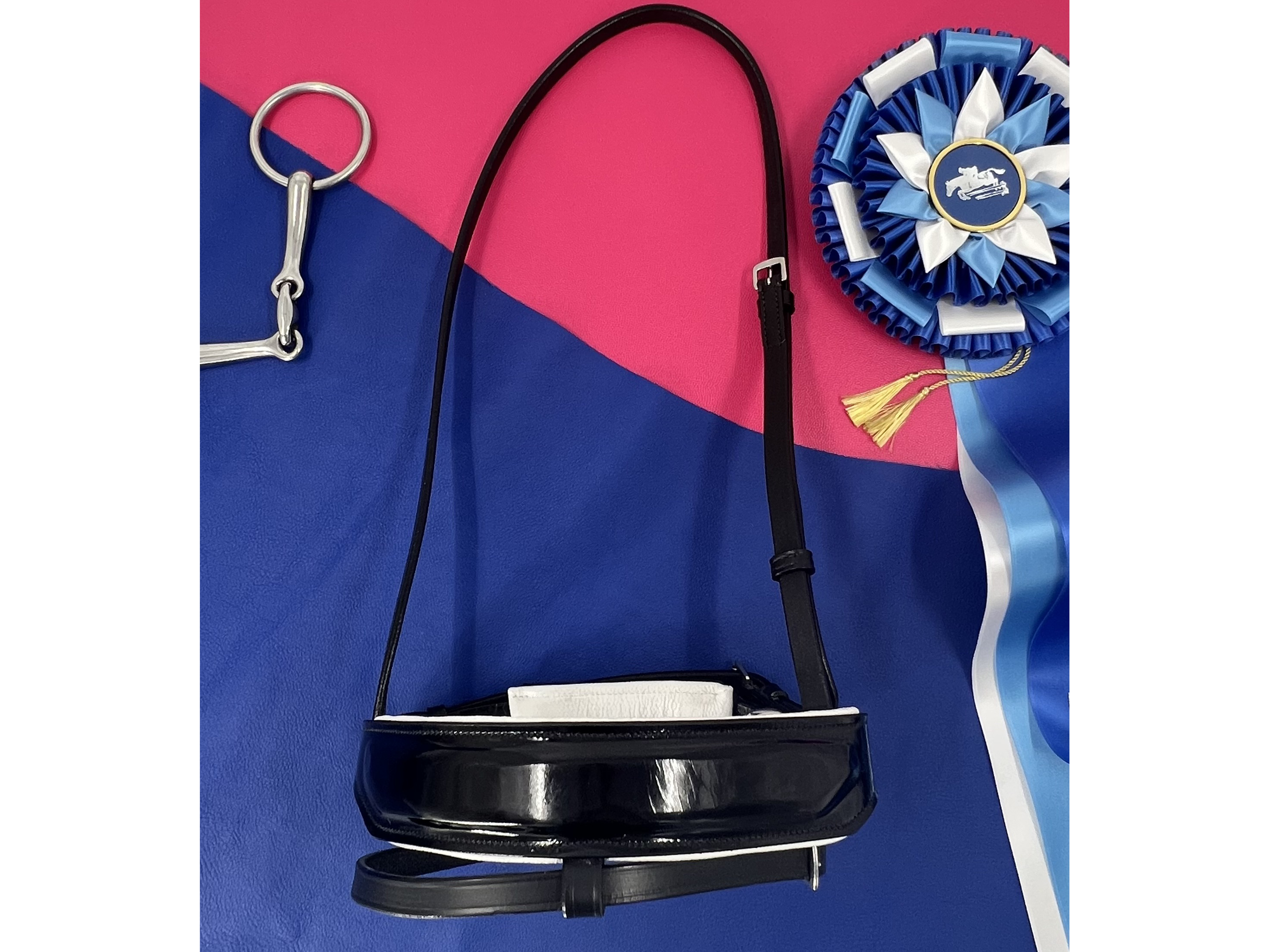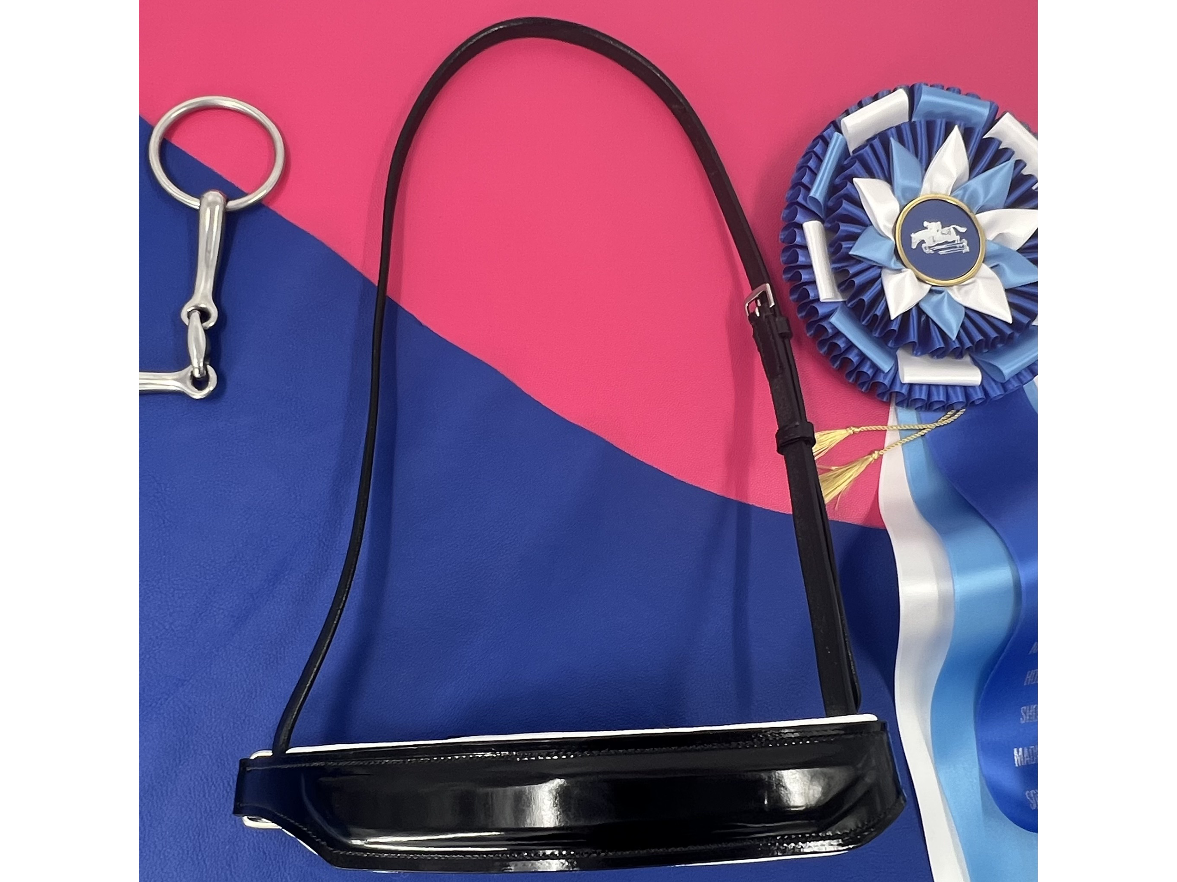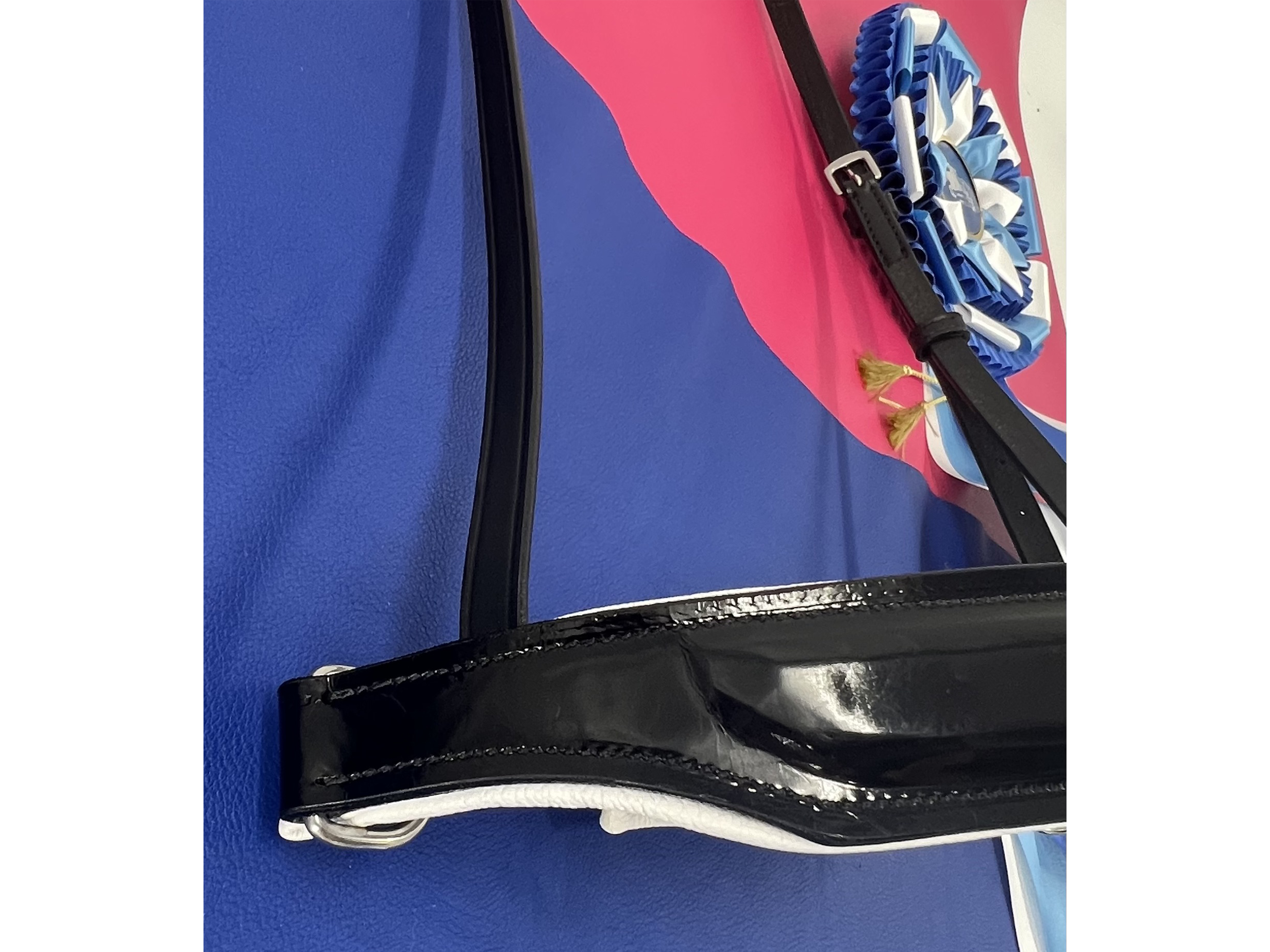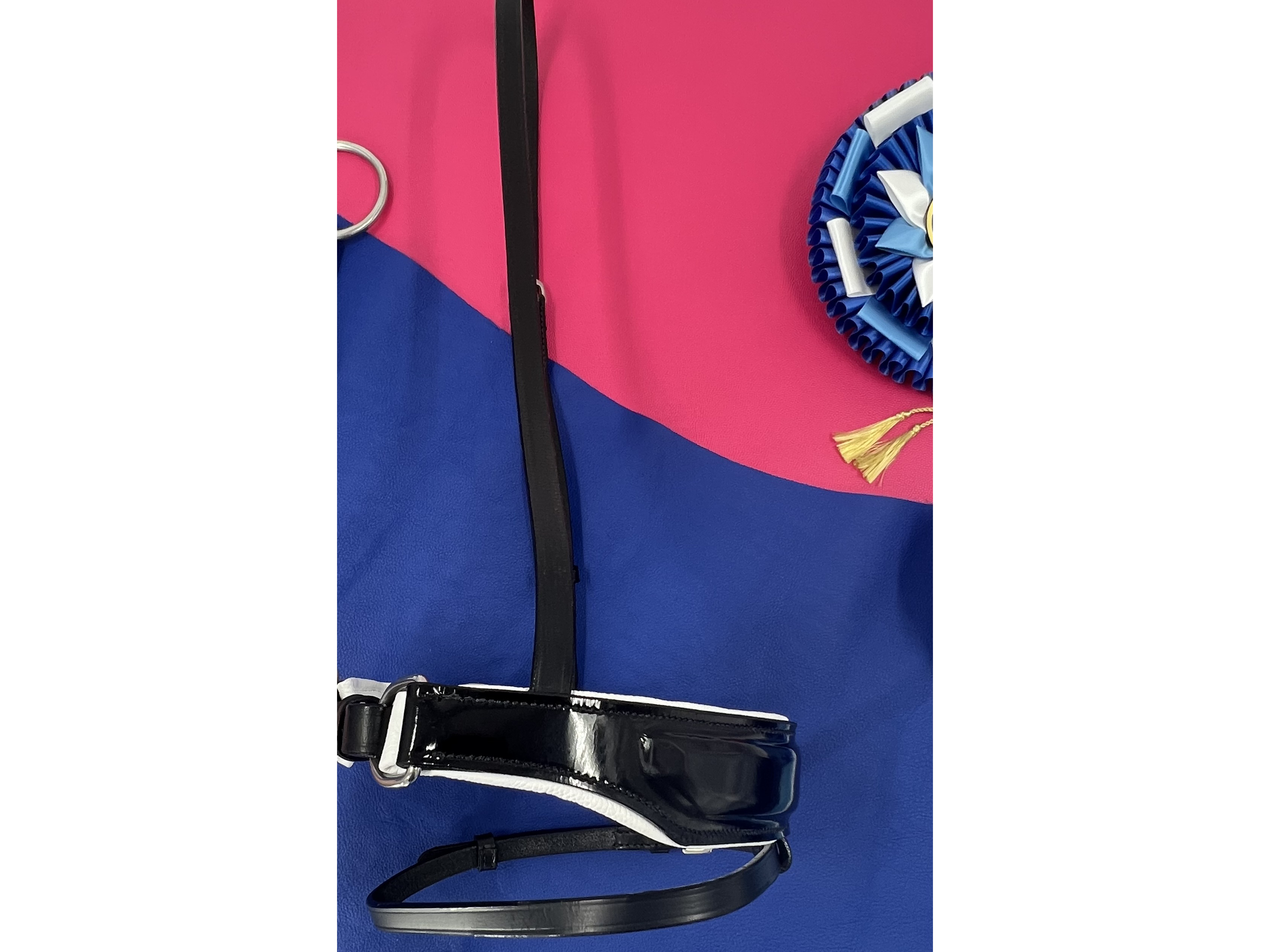 Delfina's wide anatomical noseband in a classic, flashy patent leather with bright white padding. A classic piece of dressage tack. Extra squishy padding around the nose and lower jaw. Includes a black crank pad with matching white padding. In French (without a flash) and Flash styles.