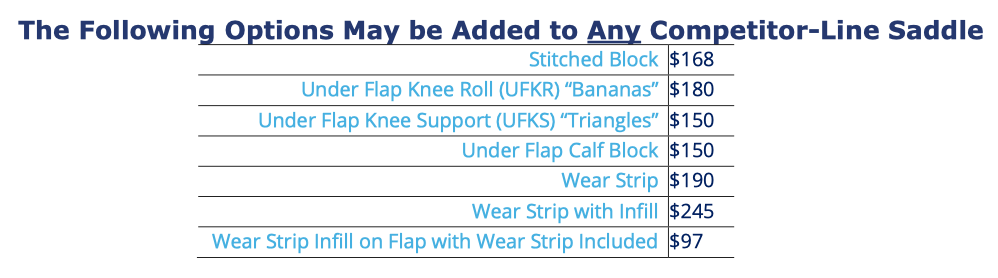 *Please Note: Some of the saddles pictured in this gallery have custom options such as special infills, custom facings, and double-stitched blocks. These options are available at an additional cost and are not included in the base prices. The photos for the VSD and GP saddles are not stock Standard Competitor models and are used to illustrate the flap style only. If we have used a photo of a saddle with custom additions or from another model line, we have noted such on the photo of that particular saddle.