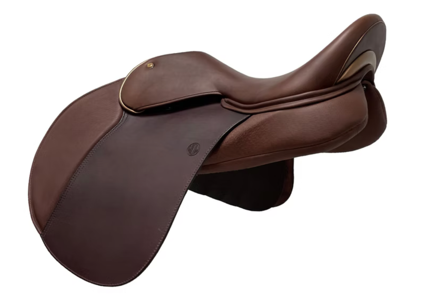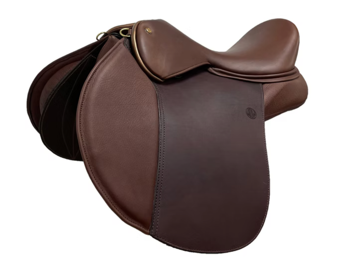 Traditional looking Hunter flap with a small removable block located under the very soft, padded knee roll. Available in smooth, Pig print or heavily oiled memel-finished leather. Comes standard with short, traditional girth billets for use with traditional jumping girths but longer dressage billets are available.
