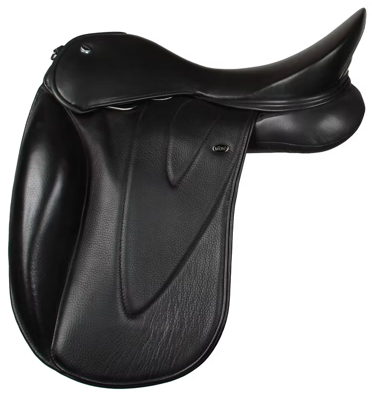 The saddles have a fixed design in either black or brown padded, aniline, Frenched-leather in combination with same-color Carbon Fiber infills and facings and same-color Pig-Print Butt (grain) leather wear strips. While the colors and leather types are fixed, there is a total choice of variants for length and angle of flap, seat design and panel design. Limited options and additions are available at additional cost.