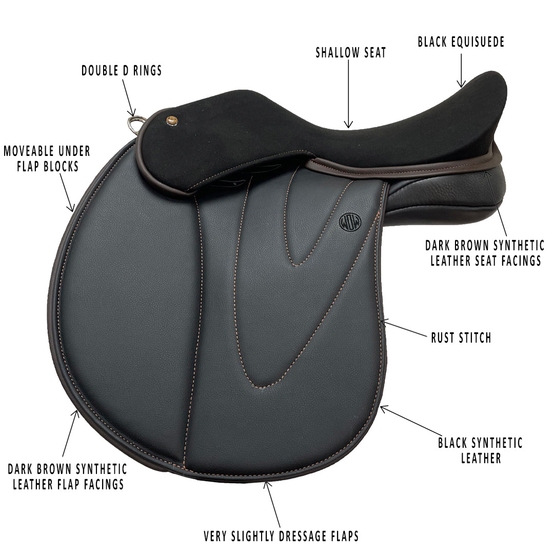 WOW's Standard Competitor Movable-Block Very-Slightly-Dressage (VSD) Saddle is forward enough for jumping whilst still being straight enough to show off the horse's shoulder. Used in the most-backward position without blocks it's an excellent showing/saddleseat/working hunter type flap.