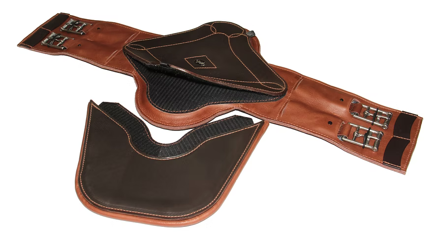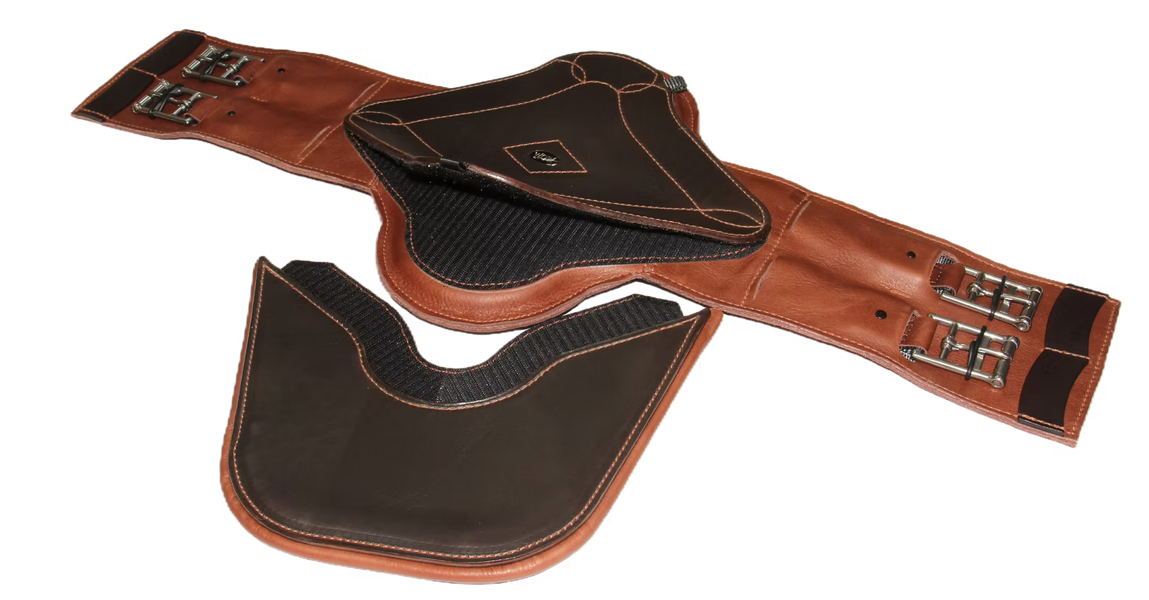 The straps of the WOW Release Girth are made of a very thin but wide flexible leather. Intended for horses that are thin-skinned or sensitive in their elbow region, if the horse manages to work the Release Girth forward against their elbow, the leather straps will curl and move with your horse rather than rubbing against the skin and creating a gall.