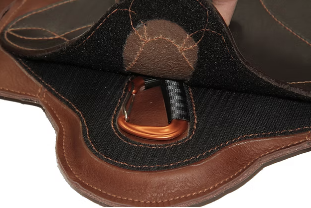The WOW Switcha Girth's sternum plate is large, comfortable and sturdy. The Plate's cover hides a carabiner fastening for attachment of martingales, breastplates, and all your other auxiliary tack.