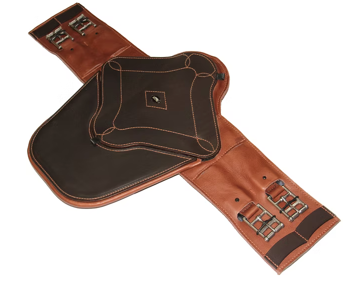 The plate in the middle hides a carabiner for attachment of martingales etc as well as the ability to attach a breast plate for jumping with studs. So this girth can be used in all disciplines Dressage, Cross Country and Show Jumping.